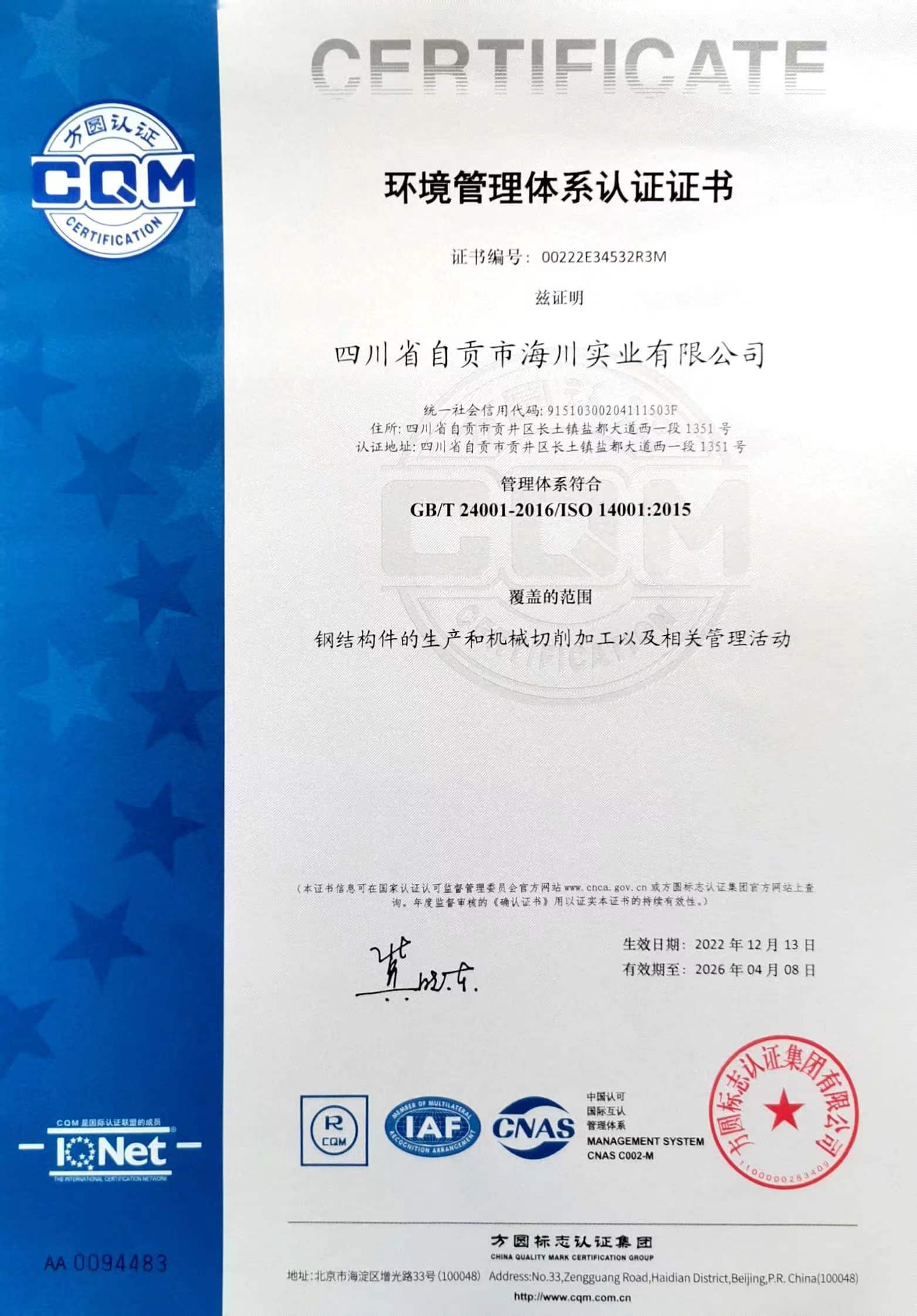 環(huán)境管理體系認(rèn)證證書(中文版)
